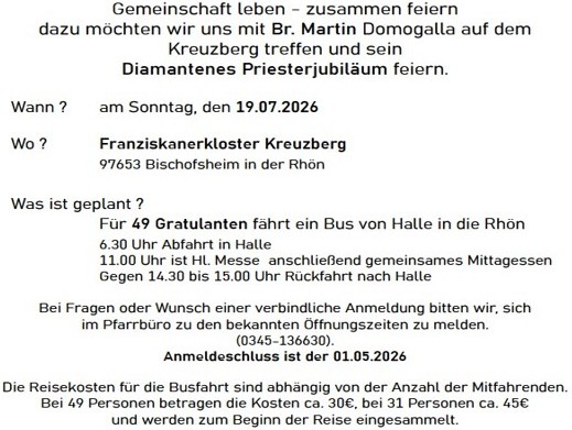 Krankenkommunion: Wir weisen hier gerne erneut auf die Möglichkeit der Krankenkommunion hin. Gemeindemitglieder, die nicht in der Lage sind, zur Kirche zu kommen, aber den Wunsch haben, zu Hause oder im Heim die Kommunion zu empfangen, werden gebeten, das im Pfarrbüro anzumelden. Sie werden dann regelmäßig von einem Kommunionhelfer oder einer -helferin besucht. Weiter bitten wir Gemeindemitglieder, die betroffene Personen kennen, sie auf die Möglichkeit der Krankenkommunion hinzuweisen.
